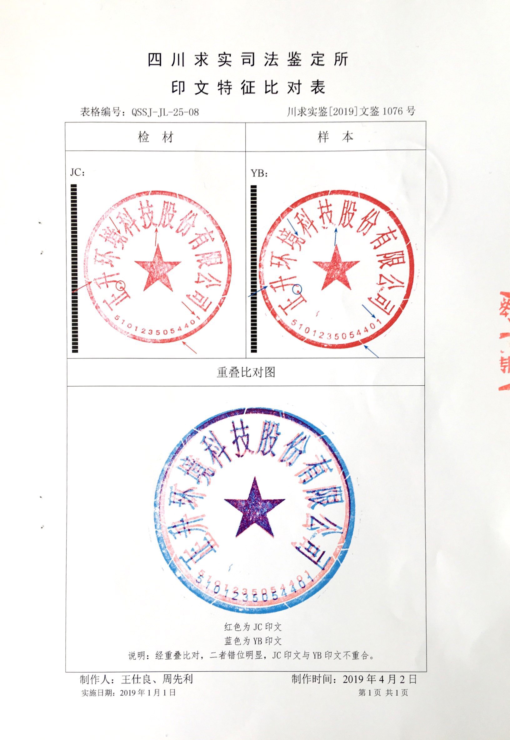我公司于2019年3月22日向四川求實(shí)司法鑒定所提交證據(jù)進(jìn)行司法鑒定。經(jīng)鑒定,四川求實(shí)司法鑒定所出具《川求實(shí)鑒【2019】文鑒1076號》印章鑒定意見書,意見為:私刻印章在印文直徑、暗記漏白線性標(biāo)識痕跡數(shù)量、位置、形態(tài)、角度;印文文字與印文邊框的距離等特征均與我公司合法公章存在本質(zhì)性差異。