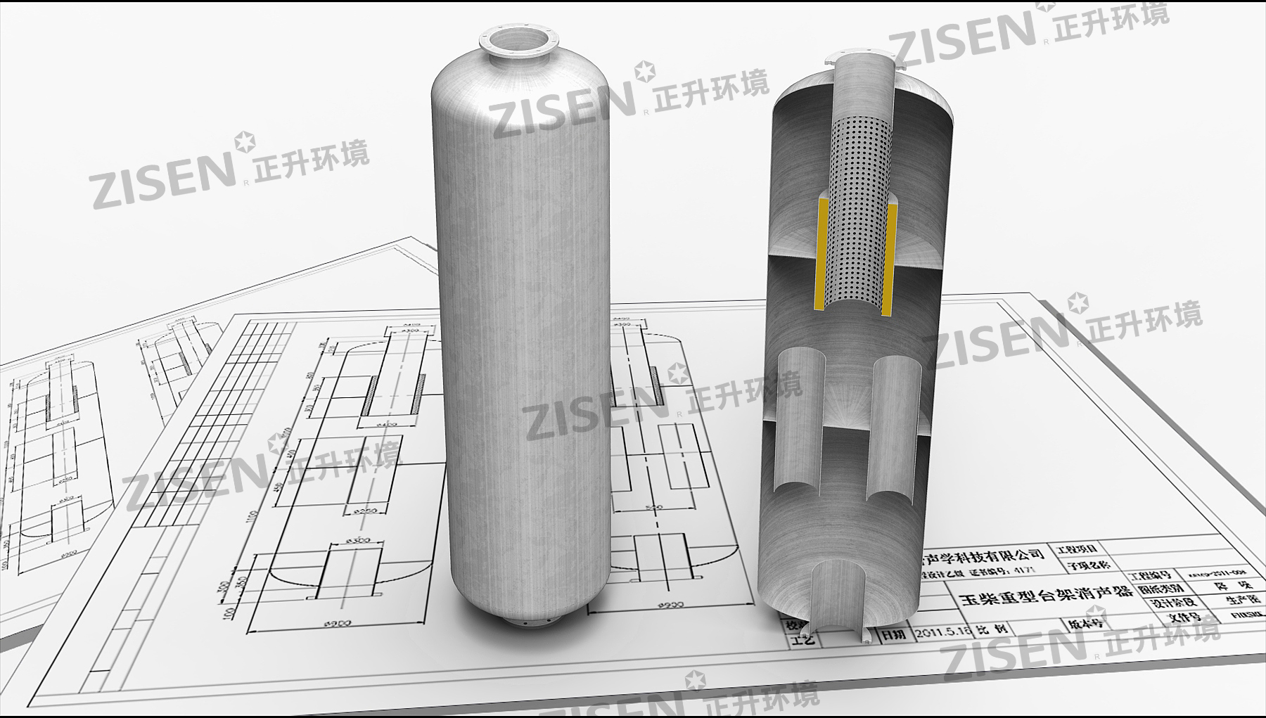 ?式消聲器為單?消聲?累加排列組合?成,?式消聲器由兩端封頭加中間吸聲體組成。吸聲體為?堿玻纖布包裹吸聲材料,護?為穿孔板。